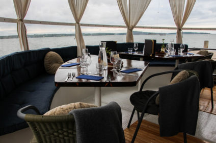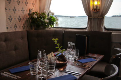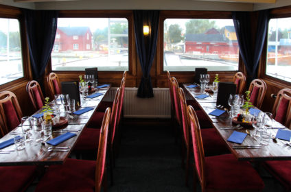 M/S Sunnan II cruises the Åland Island archipelago in the summer season. We offer lunch- and dinner cruises with a menu based on locally grown food and what the season has to offer. On the lunch cruises we serve our summer platter with smoked salmon and during the evening cruises we have a three course Á la carte menu. We also have a bar on board where we serve you find cocktails, drinks, and snacks.