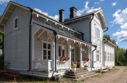 The coffee shop is situated in an old railway station from 1869 and surrounded by a park with trees as old as the station itself. You can enjoy coffee and cakes as well as salty pies and salad in the nice café or on the terrace and surrounding yard.