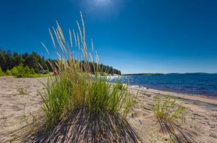 Sandy beach by the beautiful lake Kyrösjärvi. ...
